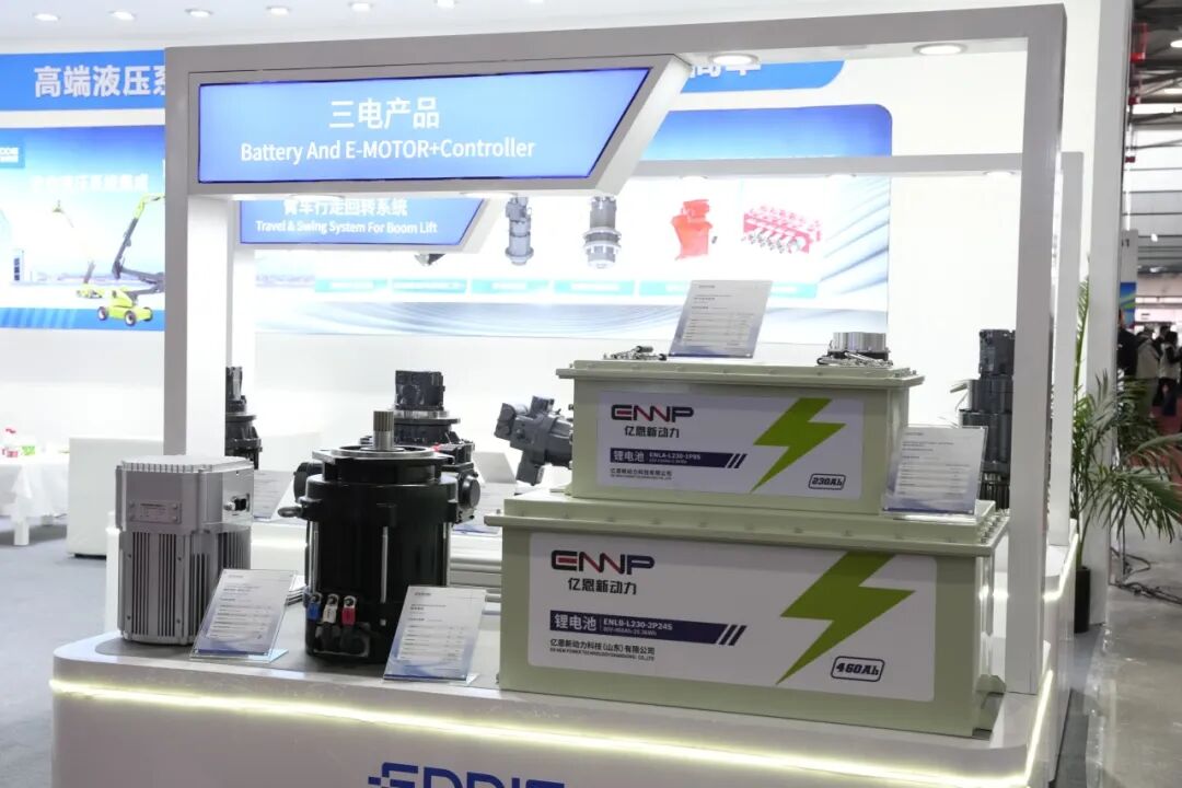 APEX ASIA展区集中展示了高机动力电池系统、高机扁线液压电机电控二合一、臂车回转总成、电驱臂车行走总成等核心产品,全面覆盖高空作业机械动力、电控等关键环节。展品融合新能源与液压技术,不仅呈现了艾迪精密在高空作业机械领域的战略布局,更针对行业绿色升级提供了多元解决方案,为工程机械的低碳发展注入强劲动力。